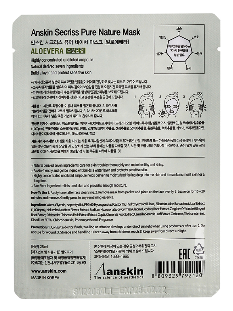 Anskin Маска для лица тканевая с алоэ вера, 25мл